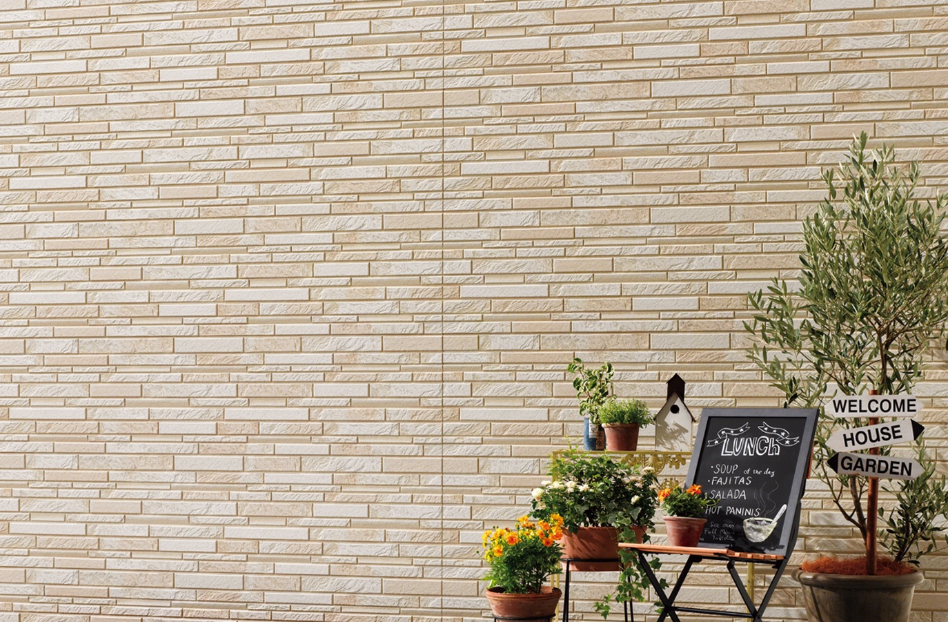 新柄は、凹凸感のある大理石とフラットな大理石を職人が積み上げたような石積デザインの「リエスタVZ」。セルフクリーニング機能、塗膜15年保証付き。平米7125円。