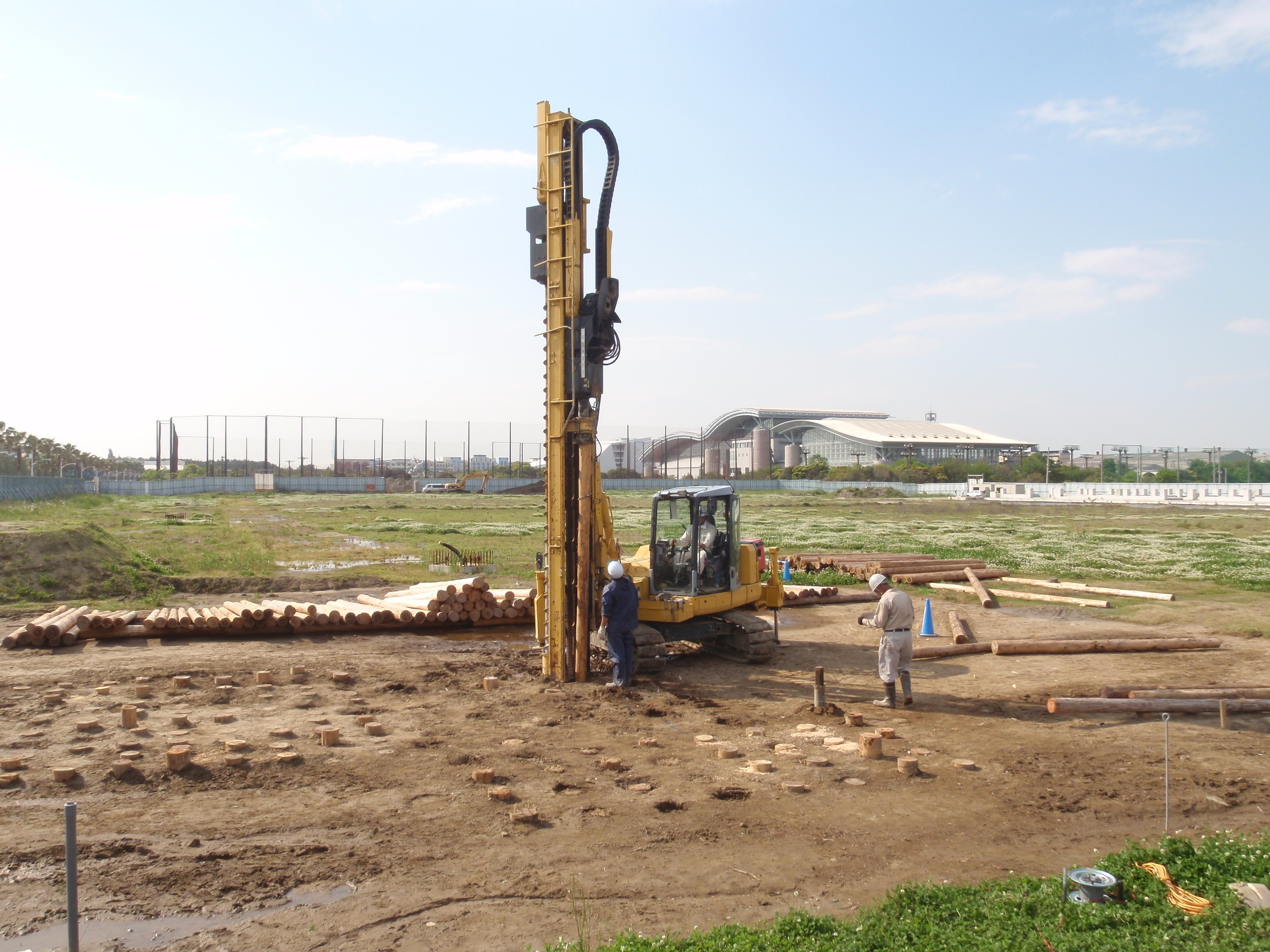 新工法「丸太打設液状化対策&カーボンストック工法(LP-LiC工法)」は、丸太を埋め込んで地下水位が浅く緩い砂地盤を締め固めることで、液状化による建物の沈下を抑制するもの。従来工法の「密度増大工法」と同等以上の地盤改良と液状化被害抑制を実現できることが確認されてたとする。
