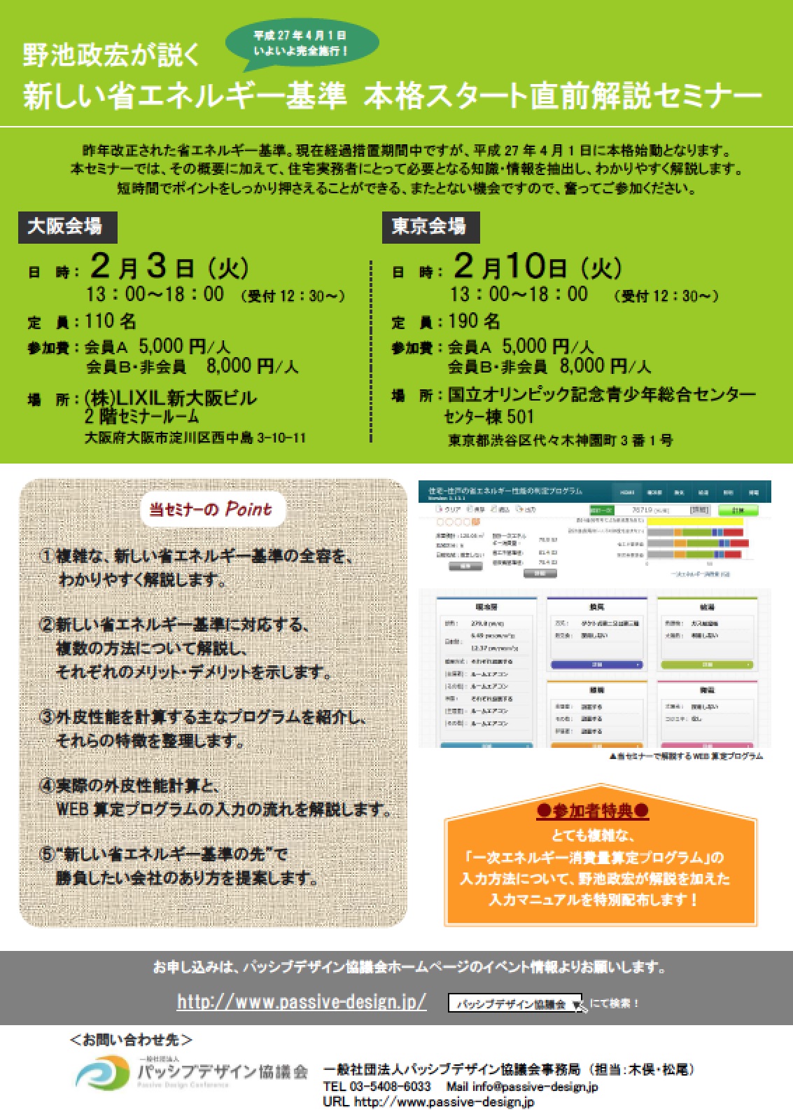 一般社団法人パッシブデザイン協議会(東京都港区)は2月、東京と大阪の2会場で「野池政宏が説く 新しい省エネルギー基準本格スタート直前解説セミナー」を開催する。