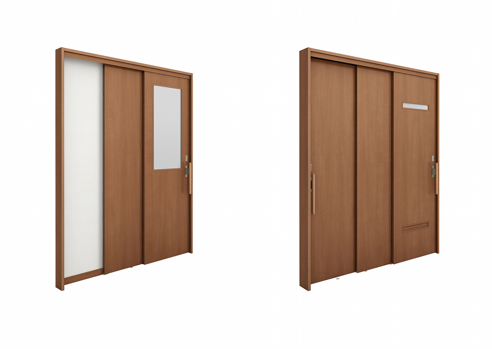 「片引戸2枚建」「引違い戸3枚建」の2タイプがあり、とくに「引違い戸3枚建」の場合は左右どちらからでも開閉可能なため、狭いトイレなどでも介助スペースをつくることができる。