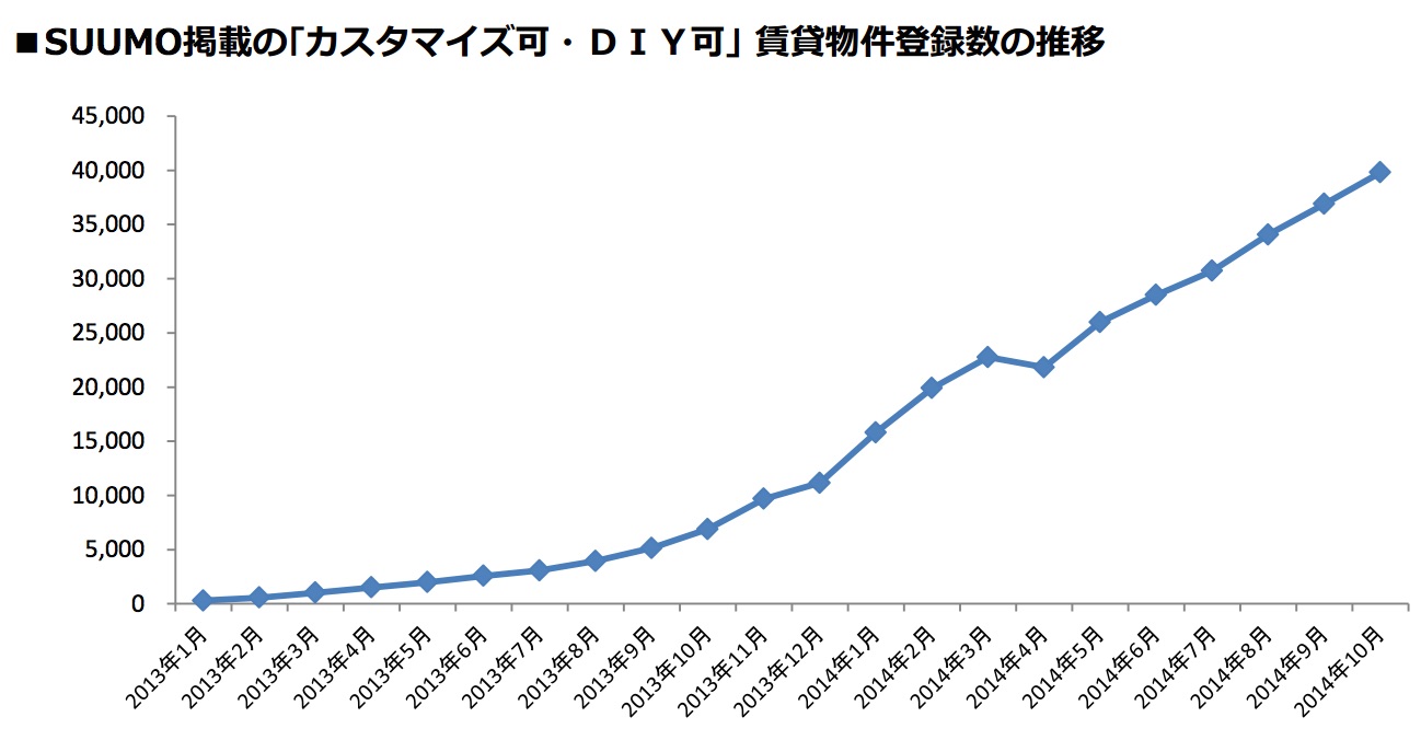 SUUMOに掲載している「カスタマイズ可」「DIY可」の賃貸物件数も2014年以降大幅に伸びており、14年10月時点で約4万件にのぼる。