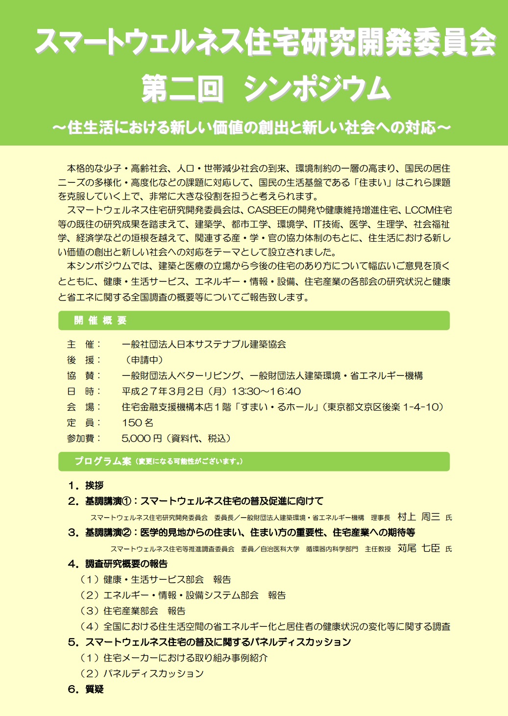 基調講演は建築環境・省エネルギー機構の村上周三理事長による「スマートウェルネス住宅の普及促進に向けて」、自治医科大学の苅尾七臣主任教授による「医学的見地からの住まい、住まい方の重要性、住宅産業への期待等」。申し込み方法はコチラから。