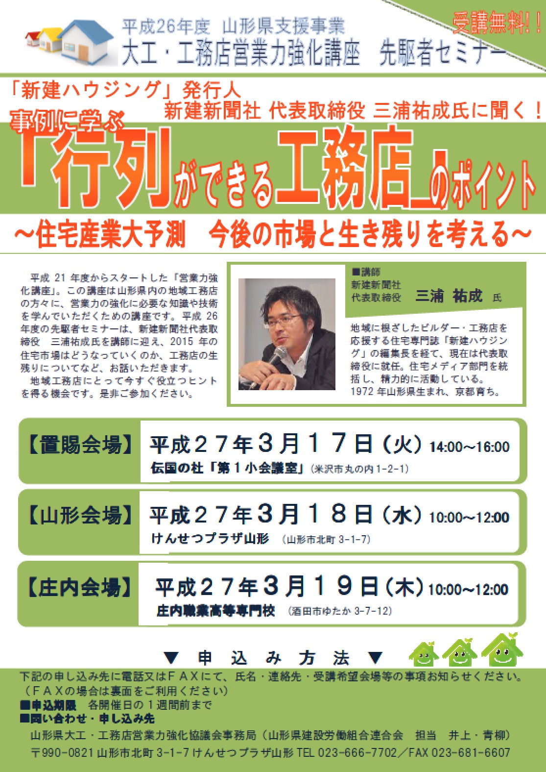 山形県建設労働組合連合会(山形市)は3月、山形県内の3会場において「大工・工務店営業力強化講座 先駆者セミナー」を開催する。