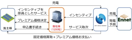 同社が再生可能エネルギー固定価格買取制度における買取価格にインセンティブを加えて電力を買い取り、新電力最大手のエネット(東京都港区)に一括販売する。得られた利益の一部は、発電した電力量に応じてパートナー企業に還元、これを保守メンテナンスサービスの原資とするなど新たなビジネスモデルの構築が可能になるとする。