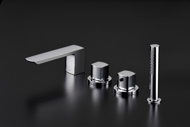 海外や著名ホテルで人気の高い角形ハンドルを採用、ハンドシャワーをデッキ上に設置した。40万円。