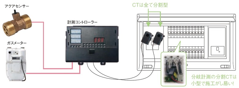 計測ポイントは電力が計7点、ガスが計2点まで。分電盤へのCT取り付け型のため既存の戸建て住宅やマンションにも簡単に導入できる。