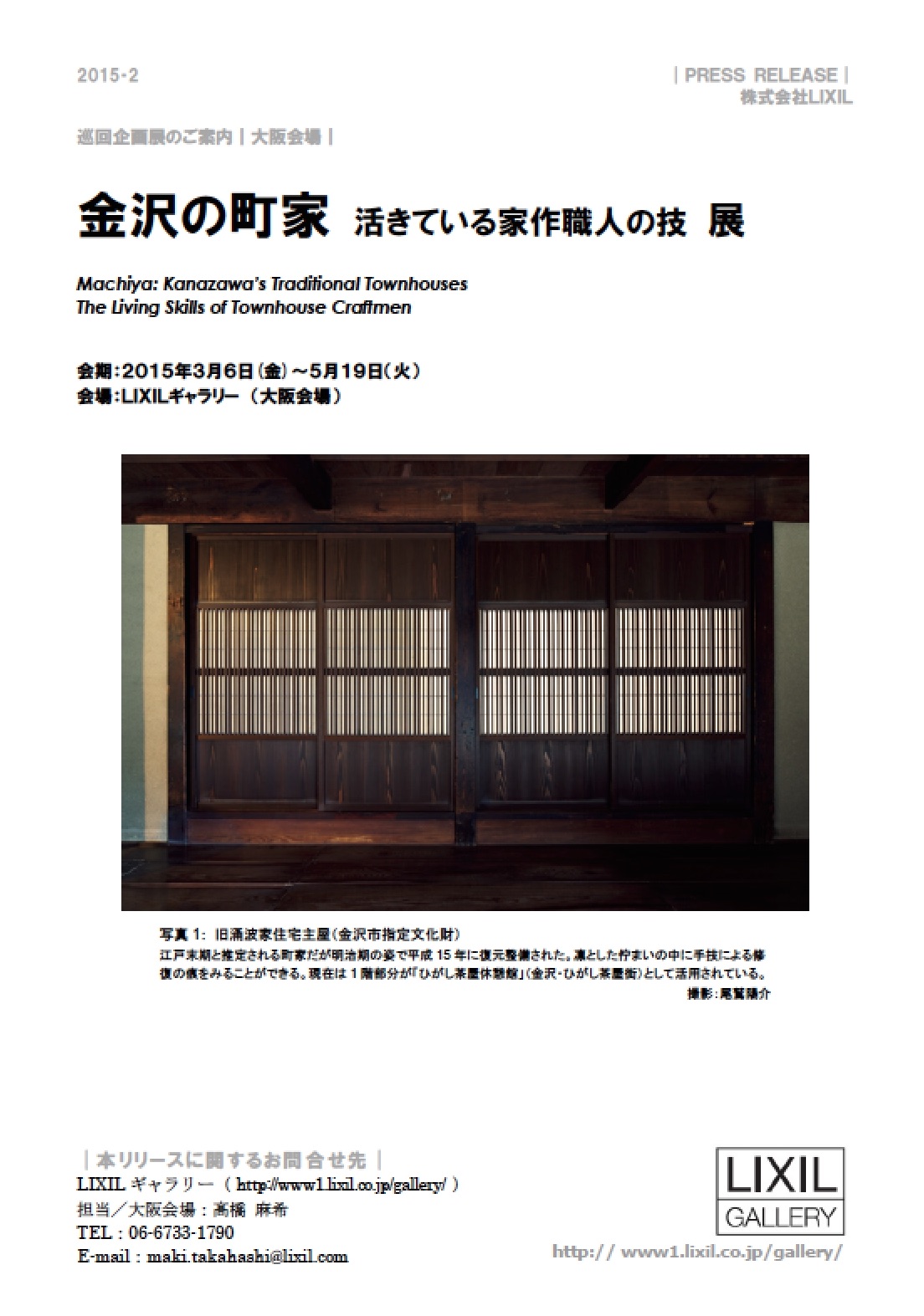 LIXILギャラリーは3月6日~5月19日、グランフロント大阪において企画展「金沢の町家 活きている家作職人の技展」を開催する。