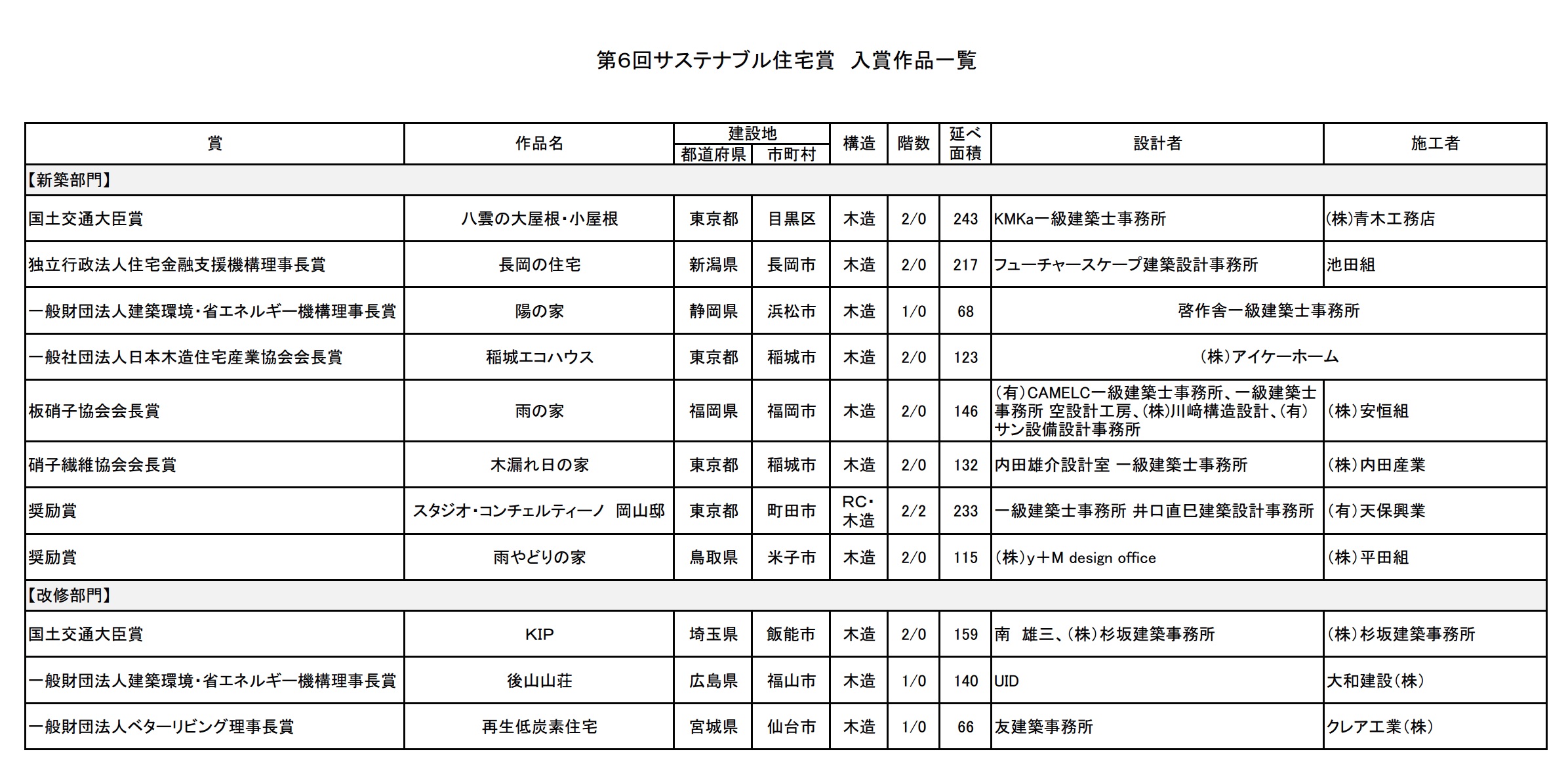 建築環境・省エネルギー機構(=IBEC、東京都千代田区)は2月6日、「第6回サステナブル住宅賞」(審査委員長:児玉祐一郎神戸芸術工科大学教授)の入賞作品11点を発表した。