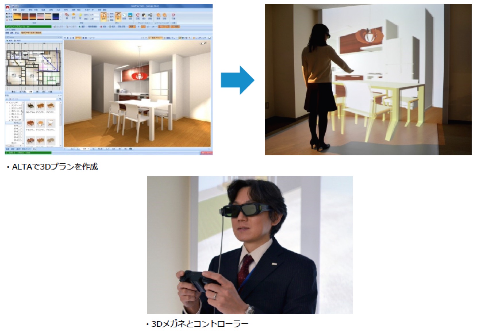 3Dメガネを装着することで本物の住宅展示場に入り込んだような感覚が味わえ、専用のコントローラーを使って部屋の内外を自由に歩き回ることも可能。ALTAで間取りやインテリア、家具、内外装材などを変更すると、バーチャル空間にも即座に反映されるため、ゲーム感覚で楽しみながらプラン提案や動線確認に活用することができる。