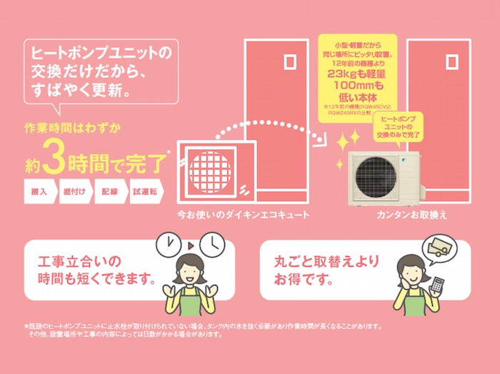 貯湯ユニットはそのままに、ヒートポンプユニットだけを交換できるというもの。施工時間は約3時間。12年前に発売した機種よりも23kg軽量で、高さも100ミリ低くなっているため、同じ場所にムリなく設置することができる。