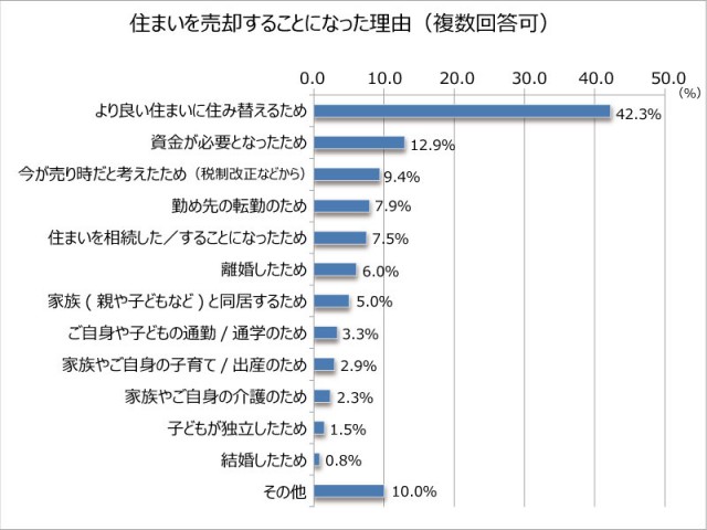 売却理由の1位は「より良い住まいに住み替えるため」(42.3%)だった。このほか10位以内には「今が売り時だと考えたため(税制改正などから)」(9.4%)、「住まいを相続した/することになったため」(7.5%)など相続税対策を含む税制改正の影響がうかがえるとした。