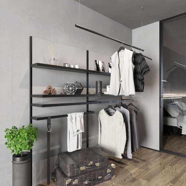 同ブランドの人気商品である「ユニットシェルフ」を使い単位を表現する。日本の木造建築の基準である3尺と6尺で構成されているユニットシェルフで、収納と生活空間が一体化した壁のない空間をつくる。日本建築の伝統的な考え方とこれからの生活空間への提案を表現したという。
