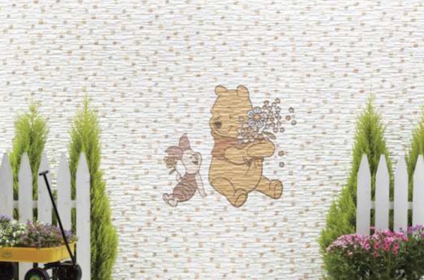 今回ラインアップしたのは、ミッキーマウス2タイプ、ミッキー&ミニー、ドナルドダック、くまのプーさん、くまのプーさん&ピグレット。キャラクターの大きさが大小2種類から選べるほか、ベース柄として各キャラクターのシルエットを散りばめたデザインを追加した。中庭の壁にも。