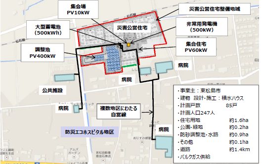 宮城県東松島市は、柳の目北地区で8月入居を目指して整備している「東松島スマート防災エコタウン」で、戸建て住宅70戸と集合住宅15戸からなる災害公営住宅85戸と周辺の病院、公共施設などを結ぶ自営線によるマイクログリッドを構築する。設計・施工は積水ハウス(大阪市)。