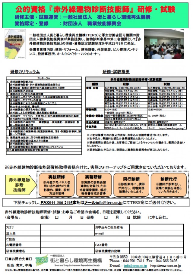 一般社団法人 街と暮らし環境再生機構(神奈川県川崎市)は4〜5月、全国7都市において「赤外線建物診断技能師」の研修と認定試験を開催する。