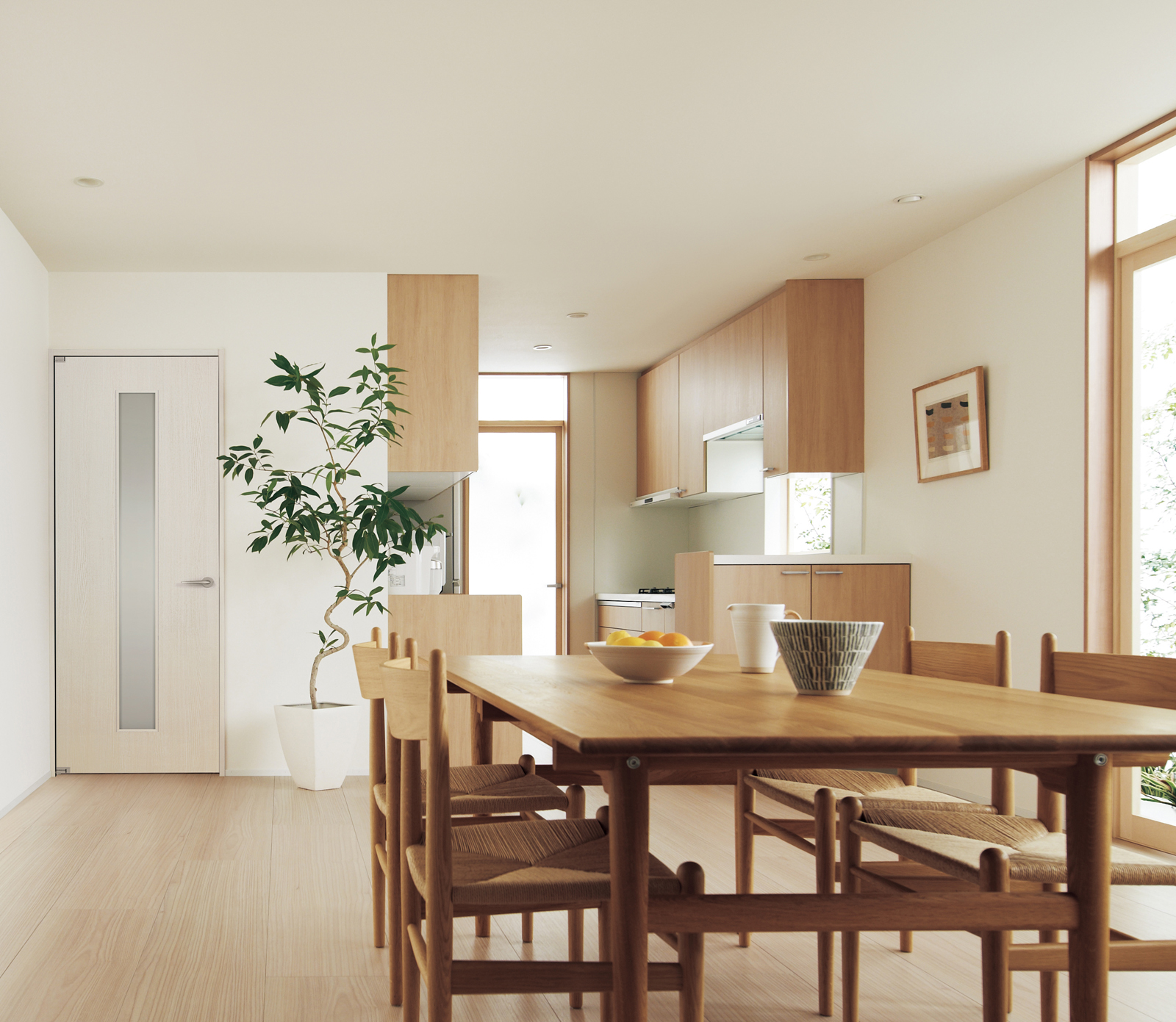 ホワイトアッシュ柄は、清潔感のあるマットなホワイト系カラーに、はっきりとした木目が特徴。アイテムは、内装ドア、収納用建具、建具・造作材など。
