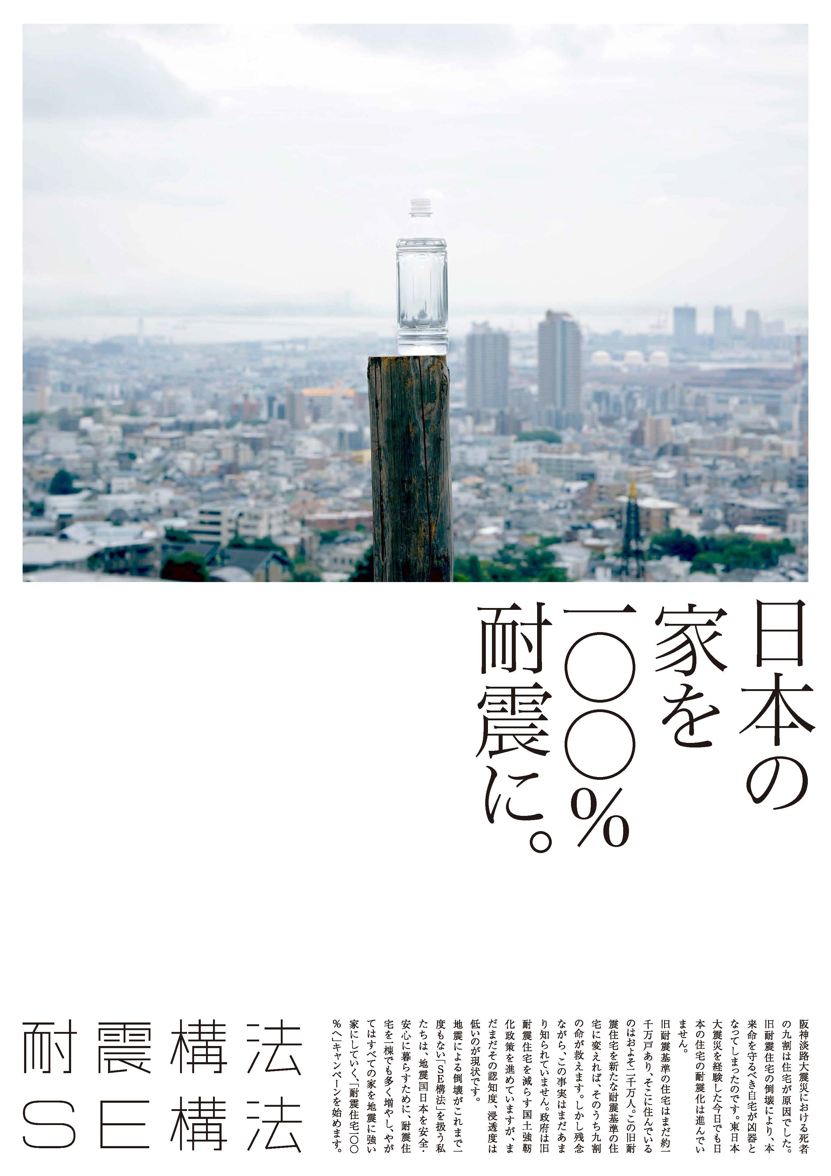 広告は、水が入ったペットボトルの背景に阪神淡路大震災で被災した神戸のまちなみが広がる写真とともに「日本の家を100%耐震に。」のメッセージを伝えるもの。