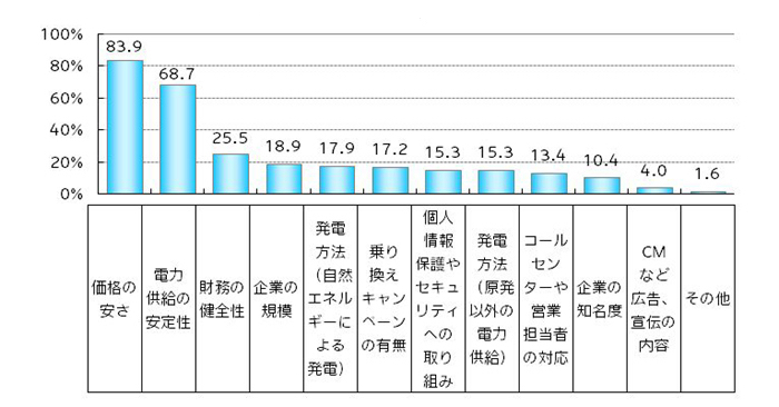 従来の電力会社と新電力会社を比べる際に重視することとしては、「価格の安さ」(83.9%)と「電力供給の安定性」(68.7%)がダントツで多かった。