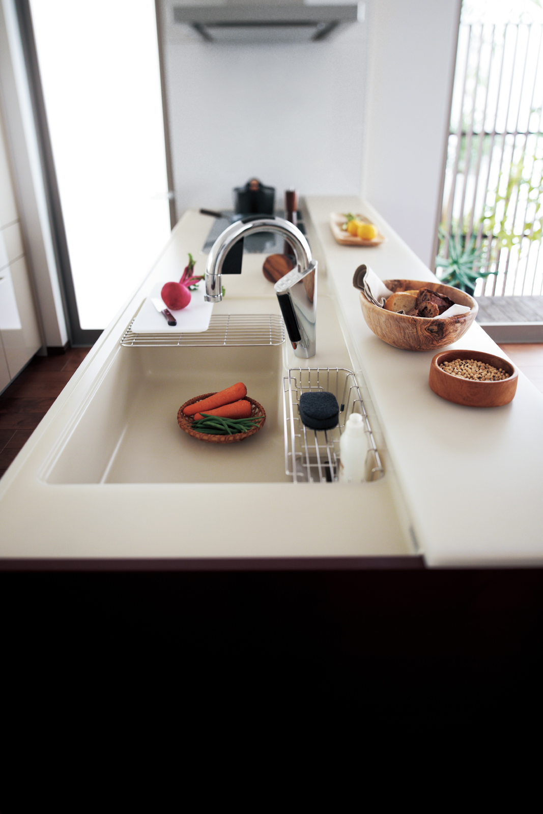 キッチンでは、「開放的にはしたいけれど手元は隠したい」「カウンターを濡らしたくない」という声に応えるため、対面側とほどよい段差をつけた「ローステップ対面プラン」をラインアップ。また、紫外線を照射することでまな板を約2分で除菌できる「まな板キレイ乾燥機」を業界で始めて搭載した。