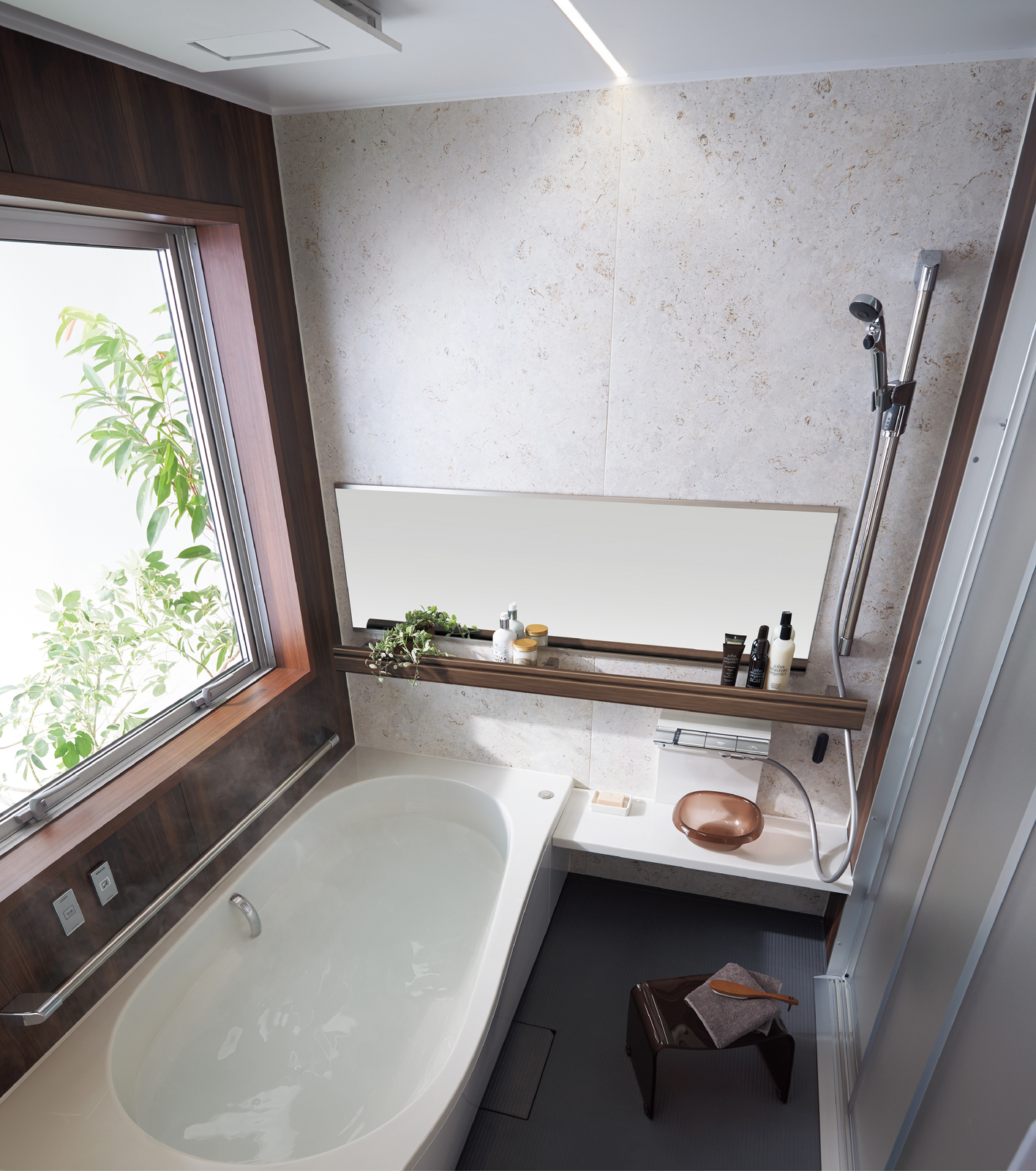 バスルームは、将来にわたって「とことんあたたかく」「みんなが使いやすい」をめざした。素早く浴室を暖め、カビを抑制する「カビシャット暖房換気乾燥機」、浴室内の一連の動作をサポートする手すりと収納を兼ねた「おきラク手すり」を揃えた。
