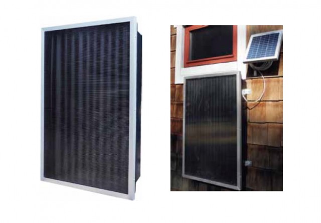 PP・PE混合プラスチック樹脂製の本体ボックスで太陽熱を集熱すると同時に、室内の冷えた空気を取り込んで加温。温めた空気はファンで送風し、室内を暖房する。