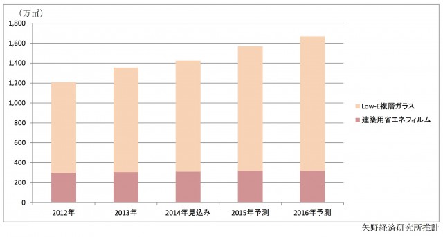 一方、2014年のLow-E複層ガラス市場は消費増税の影響により前年比6.2%増の1115万m2。省エネ住宅ポイント制度により再び上昇基調に向かうとし、2015年は前年比12.1%増の1250万m2まで成長すると予測する。