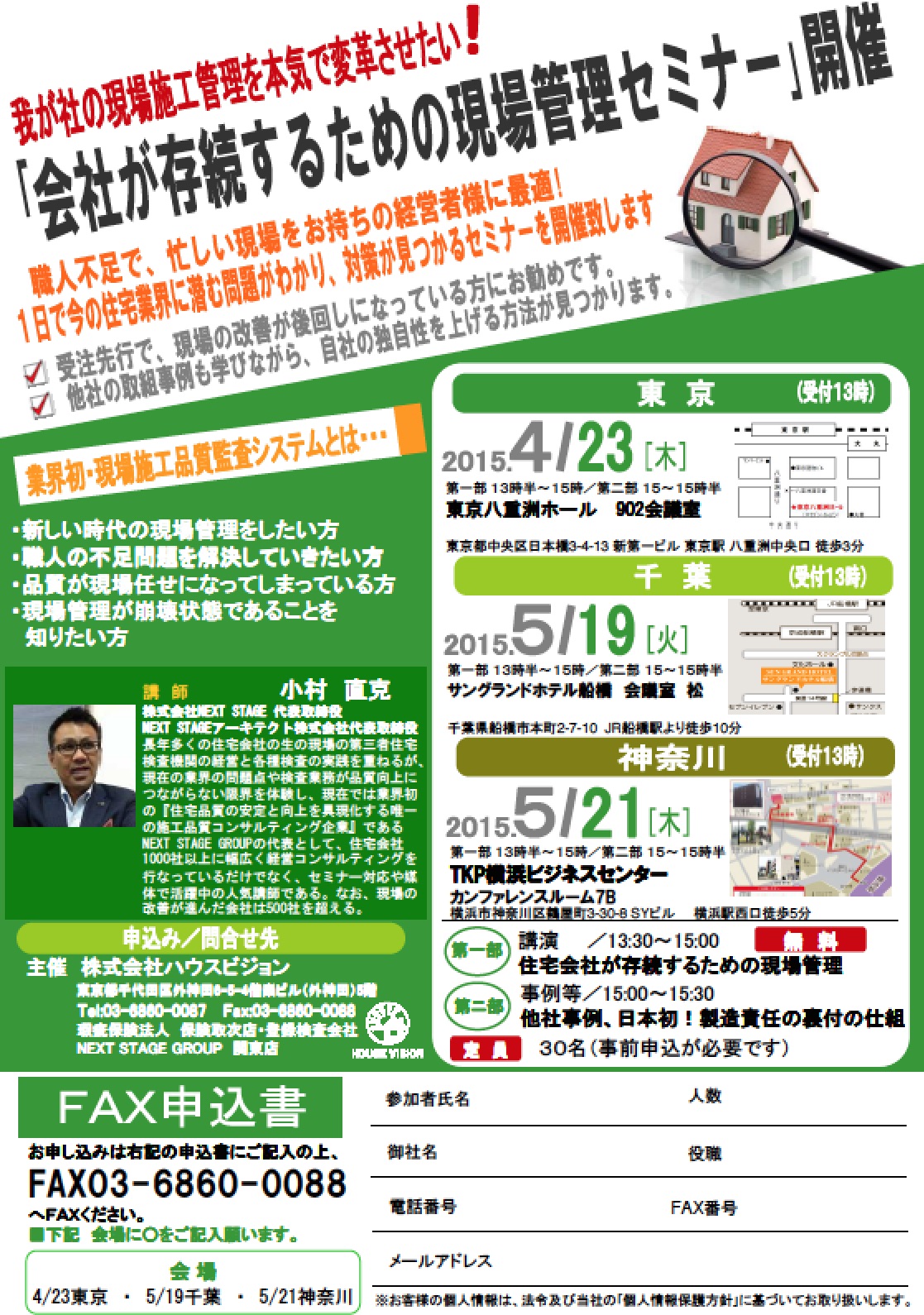 住宅維持管理サービスのハウスビジョン(東京都千代田区)は4〜5月、東京・千葉・神奈川で「会社が存続するための現場管理セミナー」を開催する。受注先行で現場が後回しになっている工務店経営者におすすめという。