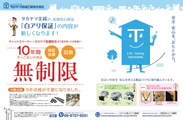 タカヤマ金属工業(大阪府大阪市)はこのほど、同社の基礎パッキンと鋼製束を使った住宅に蟻害が発見された場合に補修費用などを補償する「白アリ保証」をリニューアルした。従来の補償金額は最高500万円だったが、これが無制限になった。