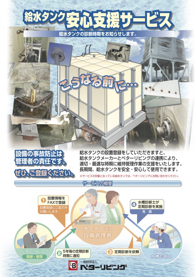 一般財団法人ベターリビング(東京都千代田区)は4月から積水アクアシステム(大阪府大阪市)、三菱樹脂インフラテック(東京都中央区)と連携し、給水タンクの適切な維持管理を支援するために所有者や設備管理者に診断時期を知らせる「給水タンク安心支援サービス」を開始した。