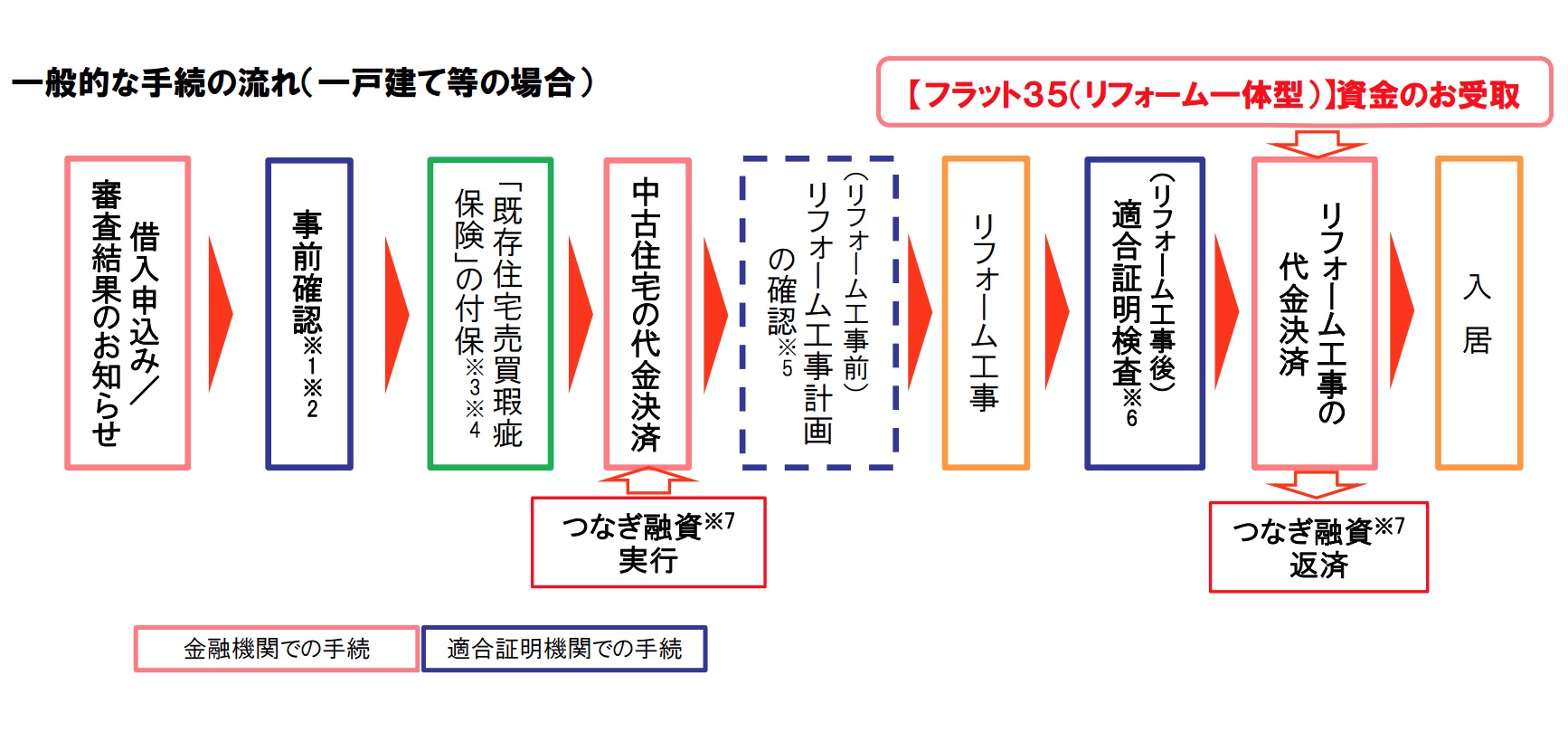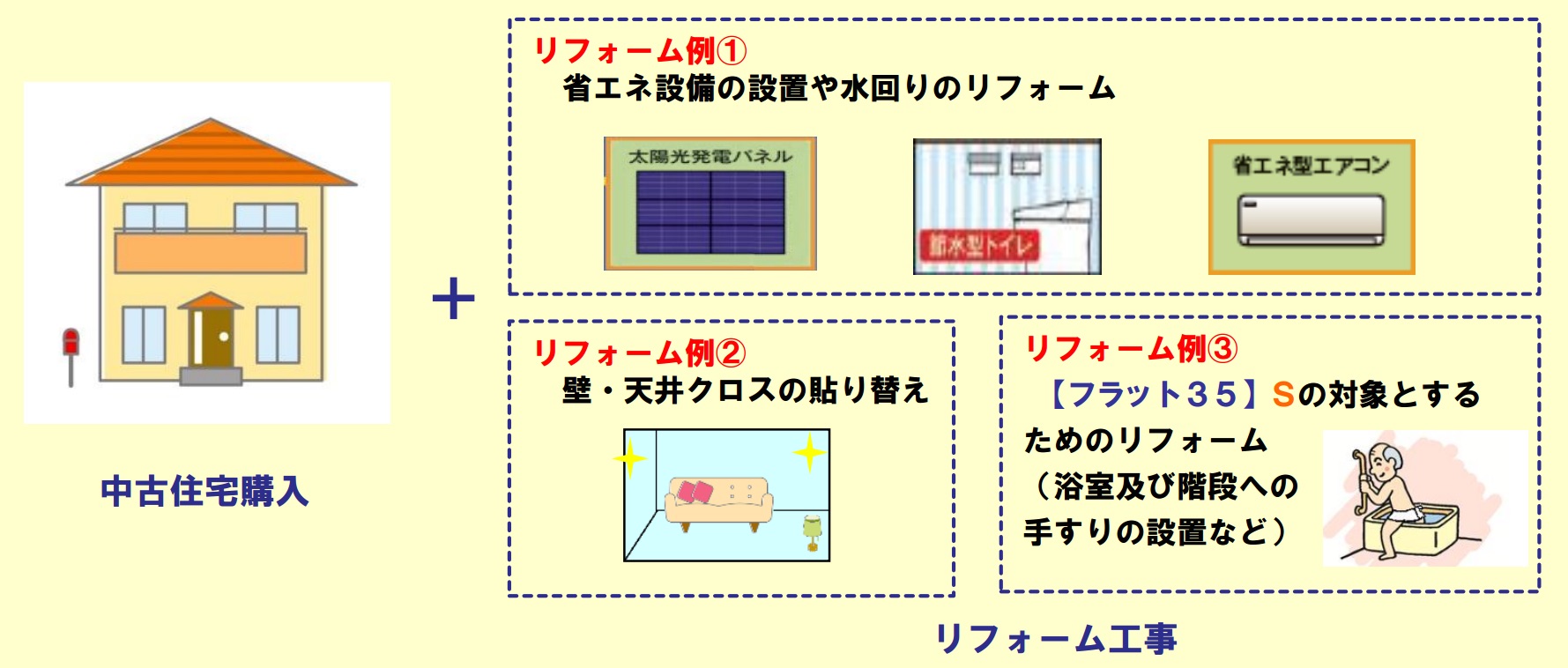 また、購入する中古住宅がフラット35の基準を満たさない場合でも、リフォーム工事により技術基準を満たせれば「フラット35」または「フラット35S」の利用が可能になる。