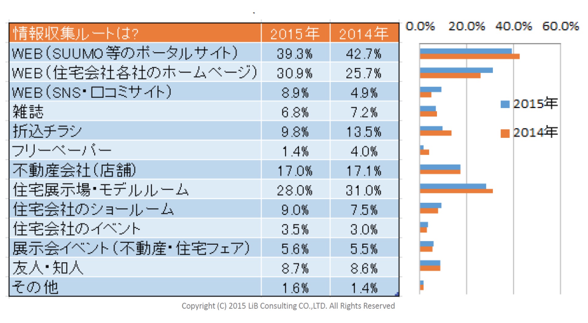 情報収集先を聞くと、「SUUMO等のポータルサイト」「住宅会社各社のホームページ」「住宅展示場・モデルルーム」の順に多かった。ただし、昨年と比べるとポータルサイトは微減、「SNS・口コミサイト」を見る人が増えていた。