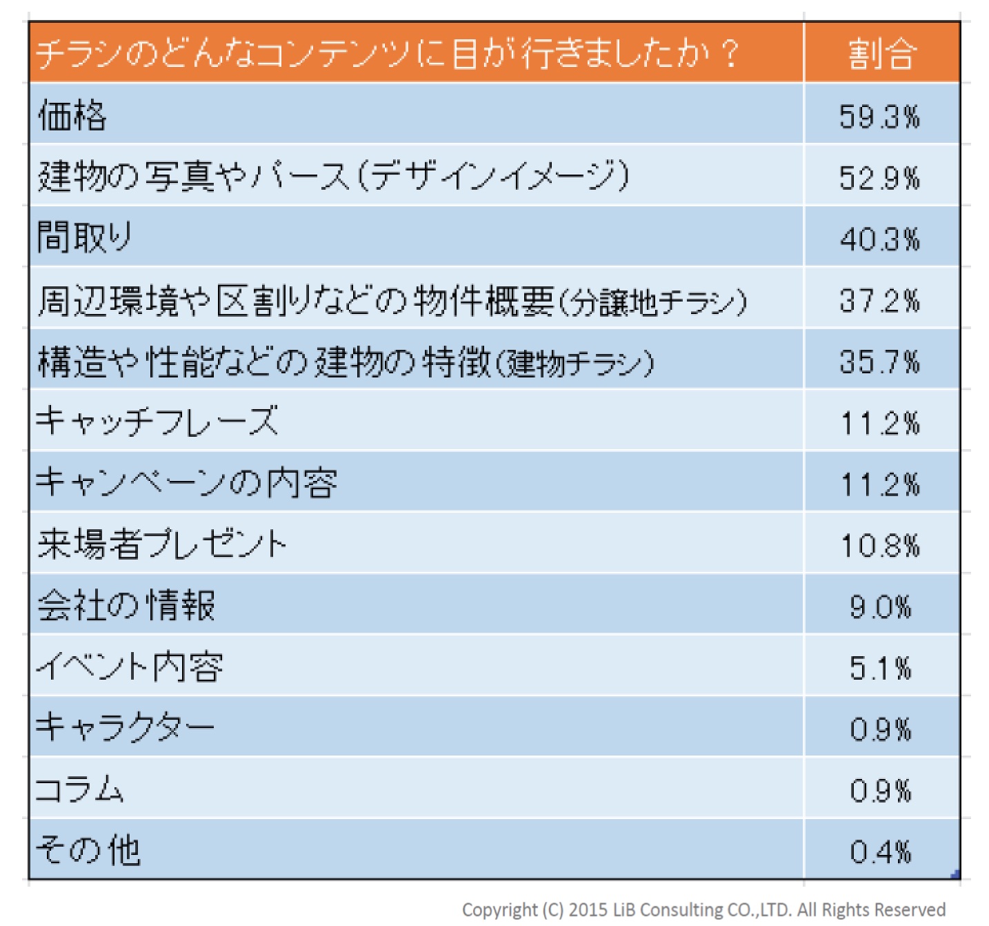 チラシのどこを見ているのかについては、「価格」「建物の写真やパース」「間取り」がトップ3。イベント内容や会社の情報はあまり見られていなかった。