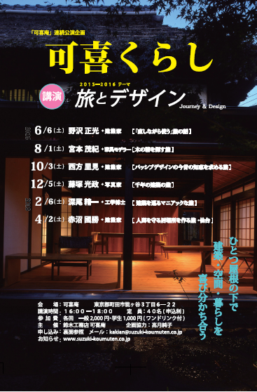 鈴木工務店(東京都町田市)は、連続講演企画「可喜暮らし」として、「旅とデザイン」をテーマに、全6回の講演イベントを行う。