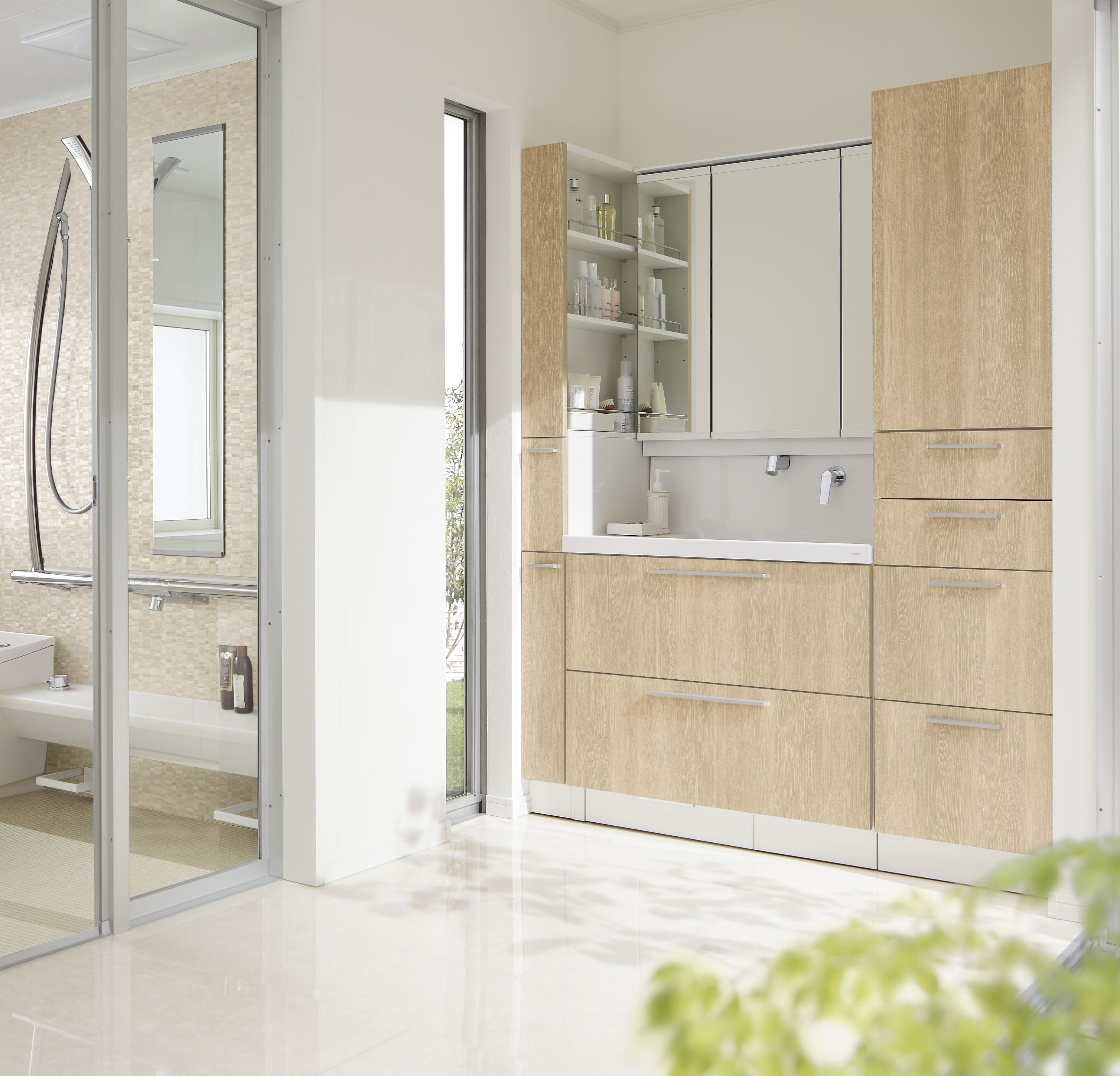 洗面所をインテリアの一部ととらえ、根強い人気があるナチュラルな木目柄5色を新たにラインアップ。これで全11色となった。同社のシステムバス「サザナ」の壁パネルとコーディネートできる。
