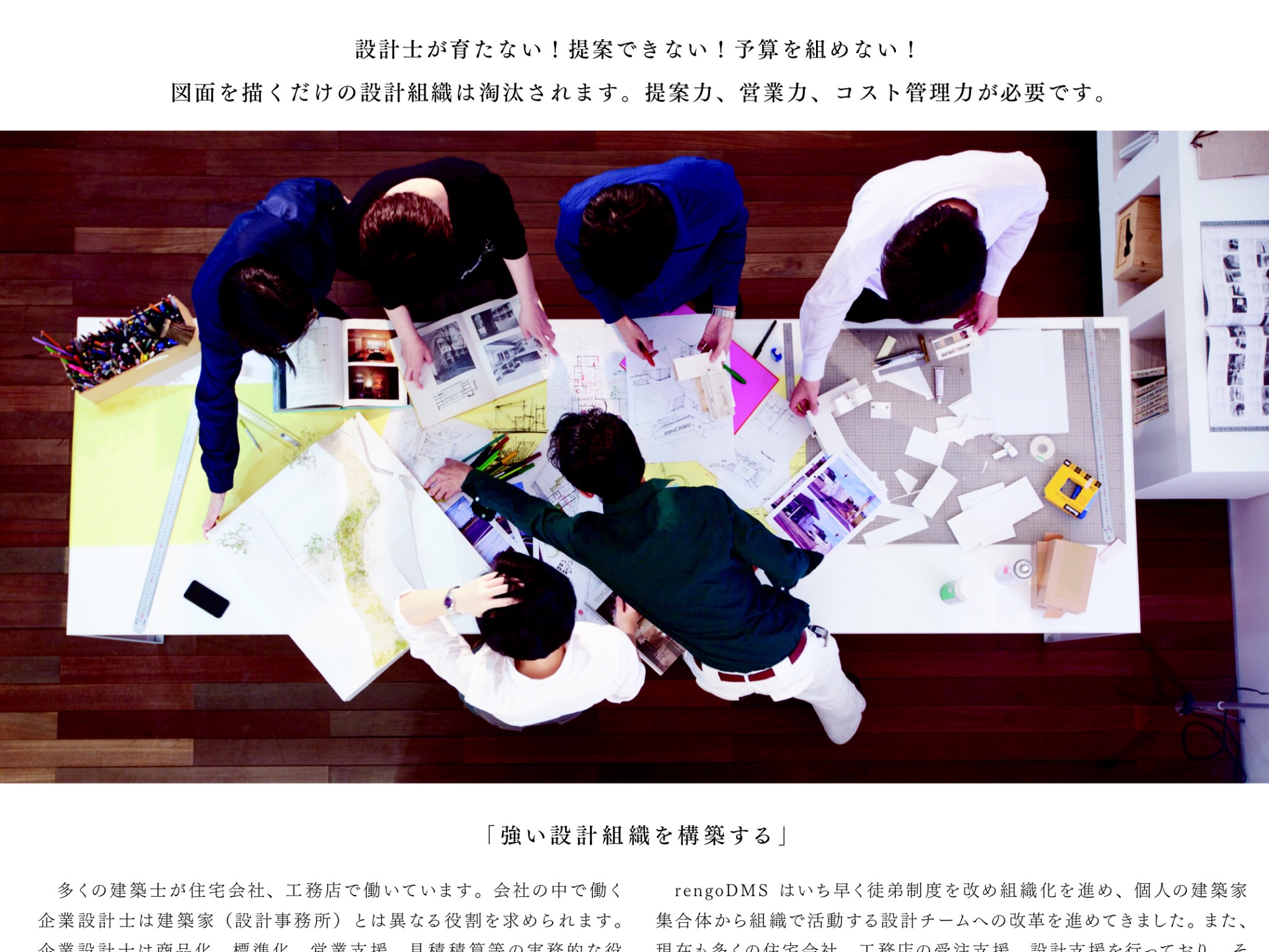 全国で木造住宅に特化した住宅設計を手がける傍ら、地域工務店向けにモデルハウス設計、商品開発、経営プロデュースまでを取り組むrengoDMS/連合設計社市谷建築事務所(東京都千代田区、戎居連太代表)は5月から、設計チームを経営の強みにするため社内設計士育成や組織的に設計業務をおこなう「設計チームの」構築の手法を学ぶ連続講座を順次開講する。地場の住宅会社や工務店が対象。