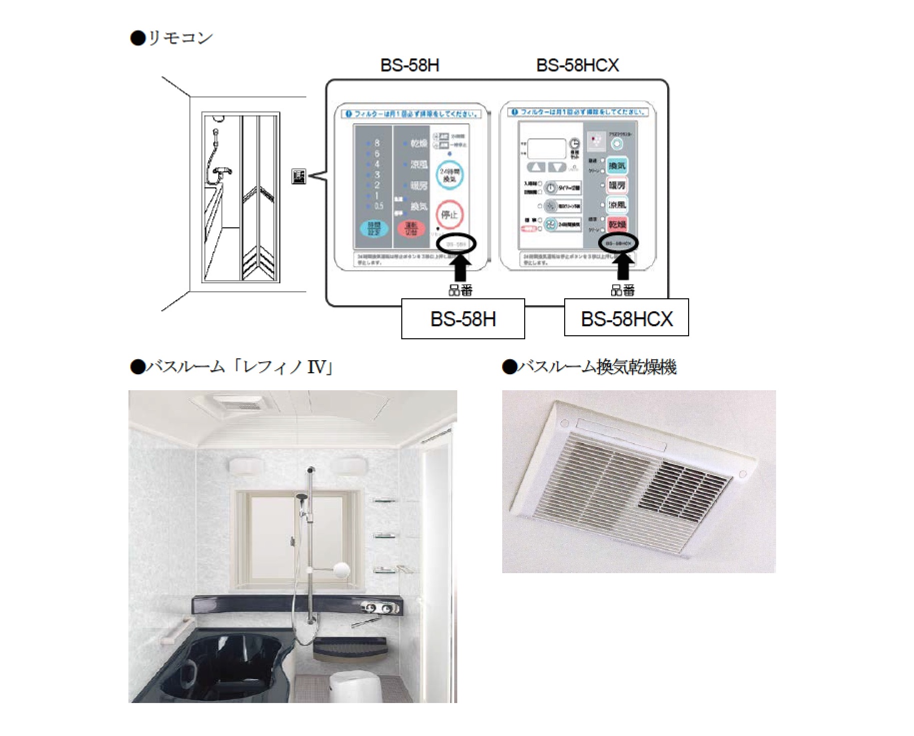 対象機種は、2003年9月〜2013年6月までに販売したトステムブランドのバスルーム「レフィノⅣ」に搭載、または「LS」「レフィノ」シリーズの修理交換用として販売したバス換気乾燥機で、対象品番はBS-58HまたはBS-58HCX。