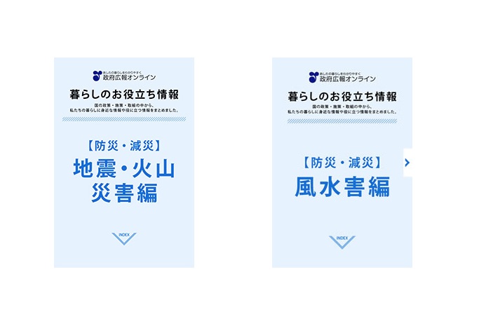 スマートフォン・タブレット端末向けの「政府広報アプリ」と電子書籍も用意。防災・減災に役立つ記事・動画をピックアップして公開する。ダウンロードはコチラから。