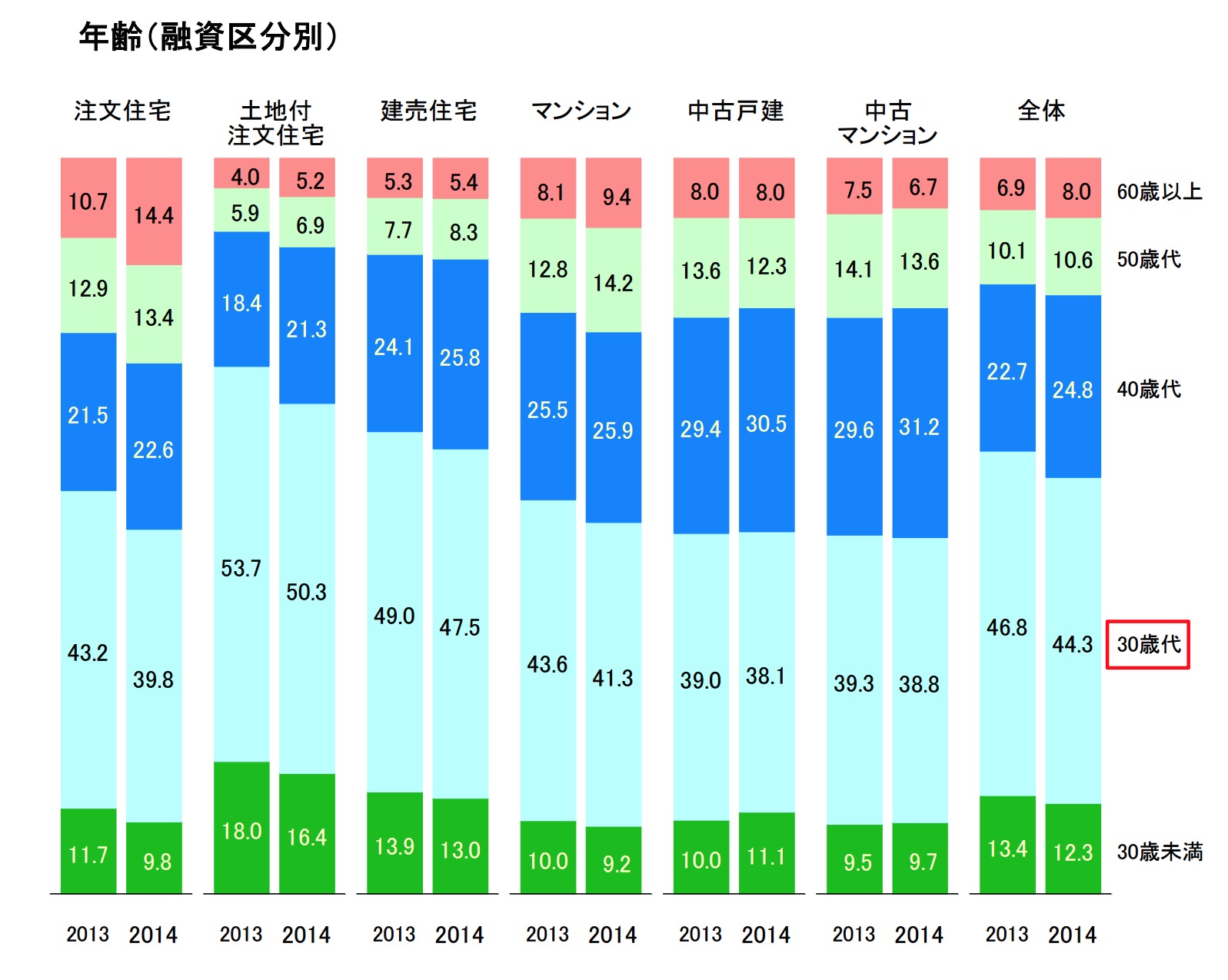 年齢の構成比をみると、30代が前年度より2.5ポイント低下し44.3%に。融資区分別にみても30代の構成比が低下していた。平均年齢は2011年度以降上昇傾向にあり、過去最高の40.4歳となった。