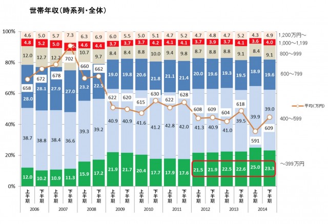 世帯年収の構成比には大きな変化がみられなかった。「400万円未満」の構成比が上半期から下半期にかけて低下し、同時期の平均世帯年収が591万円から609万円へと上昇した。