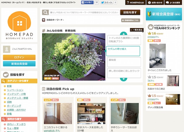 1つは、コミュニティサイトの「HOMEPAD(ホームパッド)」。「住まいをまねする・暮らしを良くするおうちのレシピサイト」をテーマに、収納、ガーデニング、DIY、メンテナンス、節約術といったアイデアを投稿し、共有することができる。