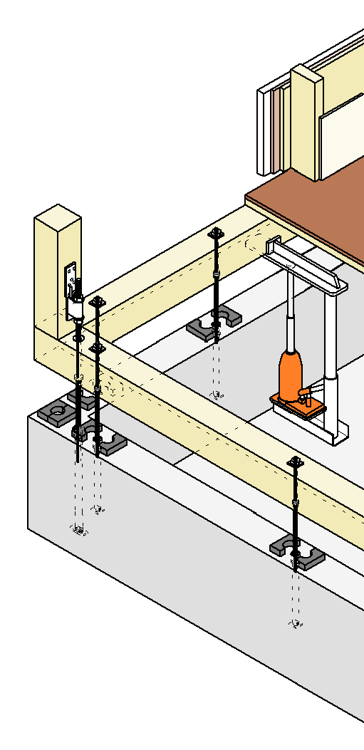不同沈下発生時にはジャッキをセットし、可動ナットを緩めることで、基礎・鉄筋・アンカーボルトを切断せずに「土台揚げ」を行うことができる。