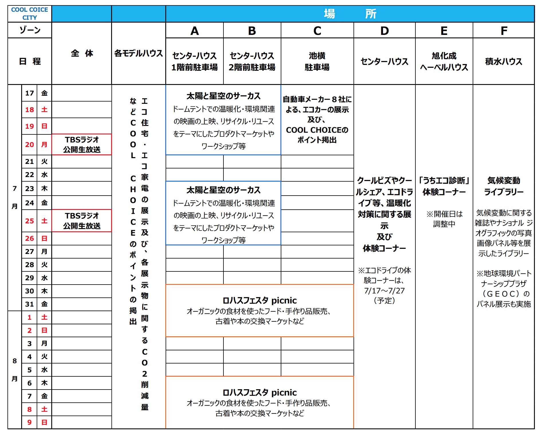 エコ住宅やエコ家電の展示のほか、クールビスやクルーシェア、うちエコ診断など温暖化対策に資するアクションに関する展示やツールを配布する。また、7月17〜20日の期間限定で自動車メーカー8社によるエコカーの展示を行う。