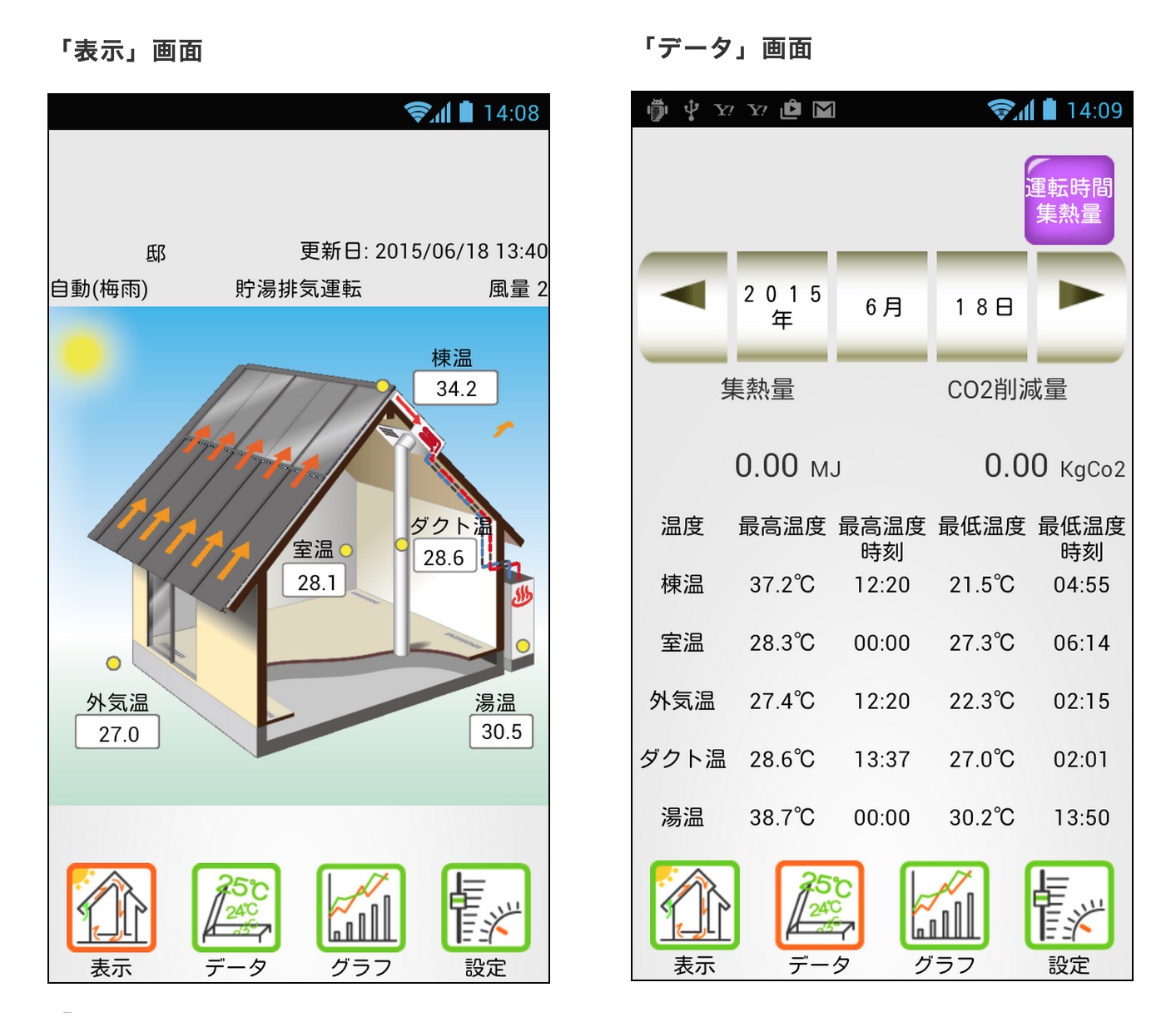 今回リリースしたアプリは、スマホからコントロールユニット「TCー8」の情報を閲覧したり、設定変更ができるもの。サーバに記録された最新の温度や運転状況をアニメーションで表示するほか、集熱量、CO2削減量、最高・最低温度、運転時間といった情報を閲覧することができる。日付変更ボタンを使えば、過去にさかのぼって情報確認が可能。