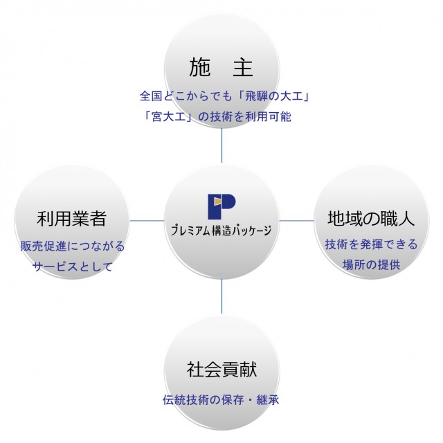 構造材の仕入れから手刻み加工、運搬、上棟サポートまでをパッケージ化。他社との差別化をめざす全国の建築業者向けに、新しい付加価値として「飛騨の大工・宮大工による手刻み加工」を提案する。