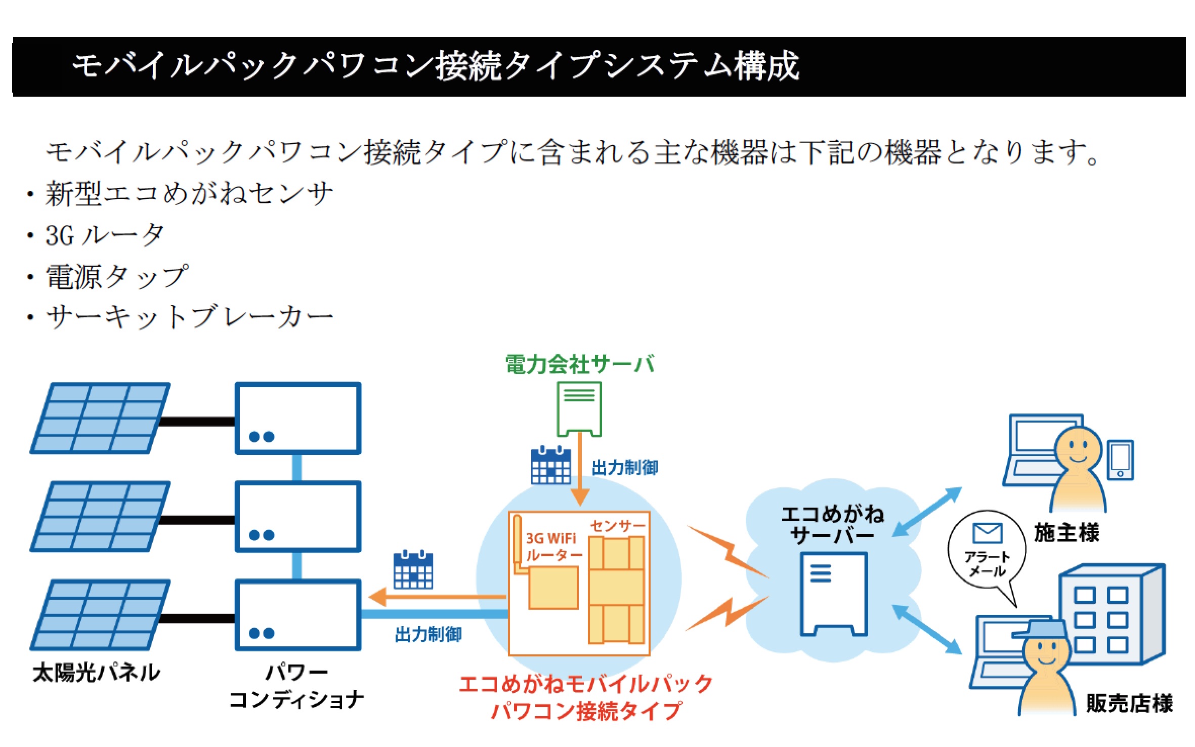 今回の「全量モバイルパックパワコン接続タイプ」は、オムロン製パワコンを対象に、通信回線付き遠隔監視装置のなかに発電制御機能を内蔵してオールインワンパッケージとして提供。出力制御機能の自動アップデートの追加費用、設置現場での作業、追加機器の設置が不要になるという。
