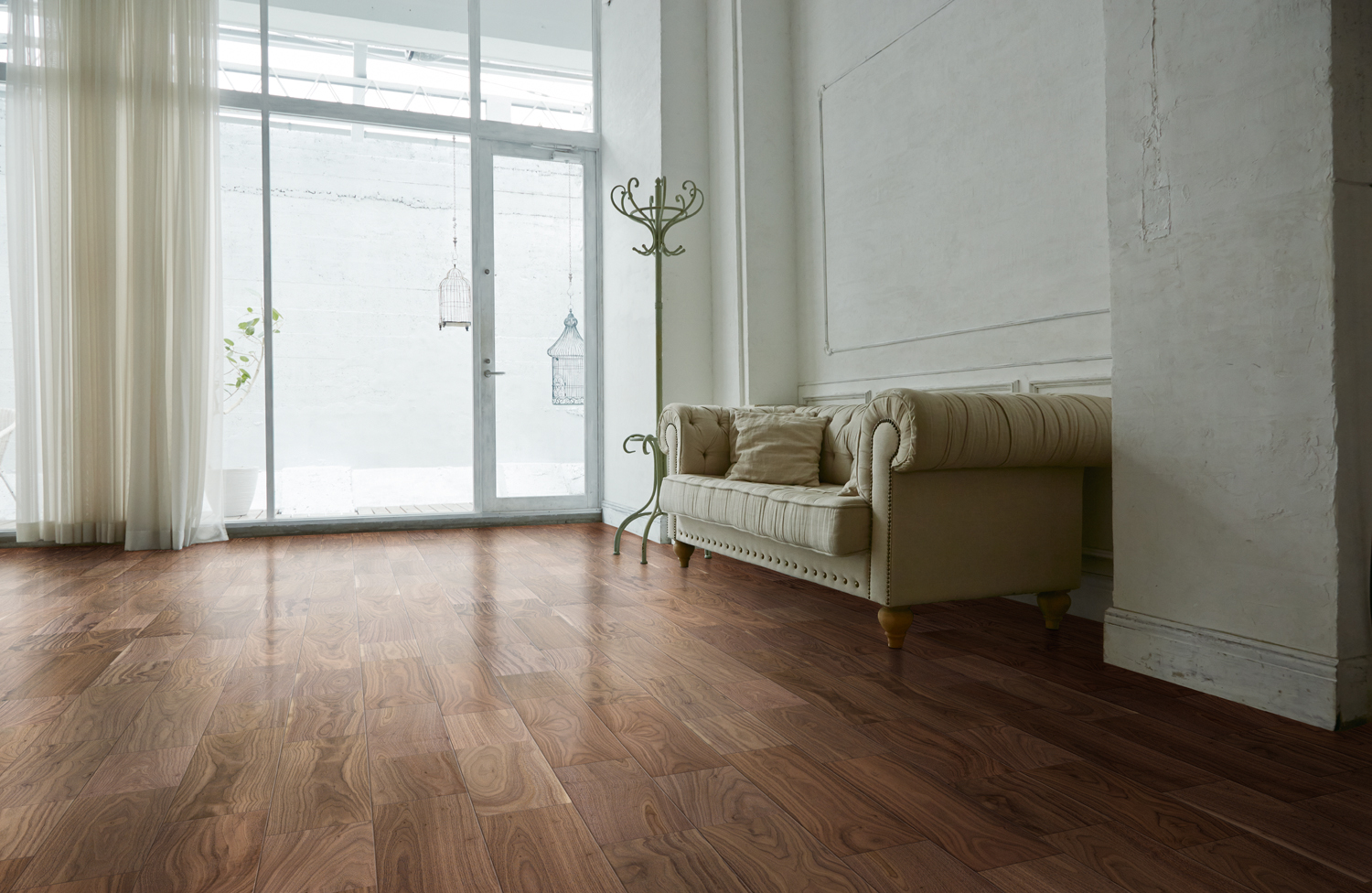 表面材はブラックチェリー、ウォールナット、ハードメープル、オークの4樹種。環境性と耐久性を両立する独自のナチュラルオイルフィニッシュで仕上げた。 1818x303x12ミリ。4万9000円/束〜。