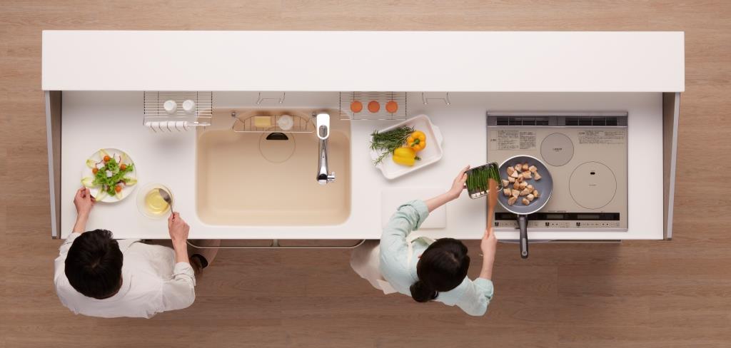 同社調査によれば、共働き世帯では6割以上が2人以上でキッチンを使用することがあり、定年後世帯では男性の7割弱がキッチンでの家事に参加していると回答。現在のキッチンに対して「並行作業」「作業分担」がしづらいといった不満をもっていることがわかった。