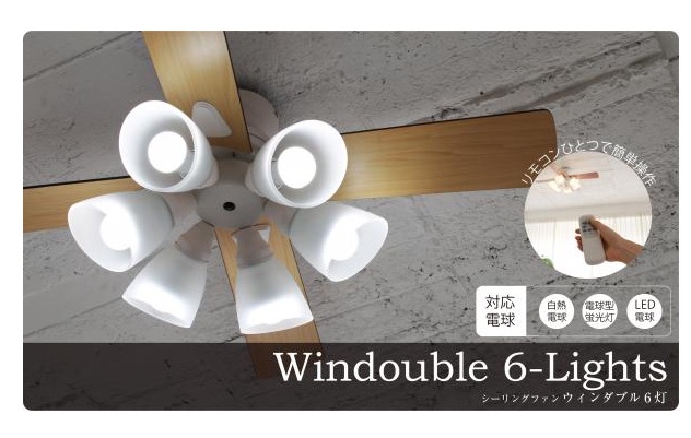 阪和(大阪府大阪市)は9月1日、6つの電球型蛍光ランプとシーリングファンを組み合わせた新商品「プラスモアBIG-102シーリングファンWindouble6灯」を雑貨店、量販店、インターネットで発売する。