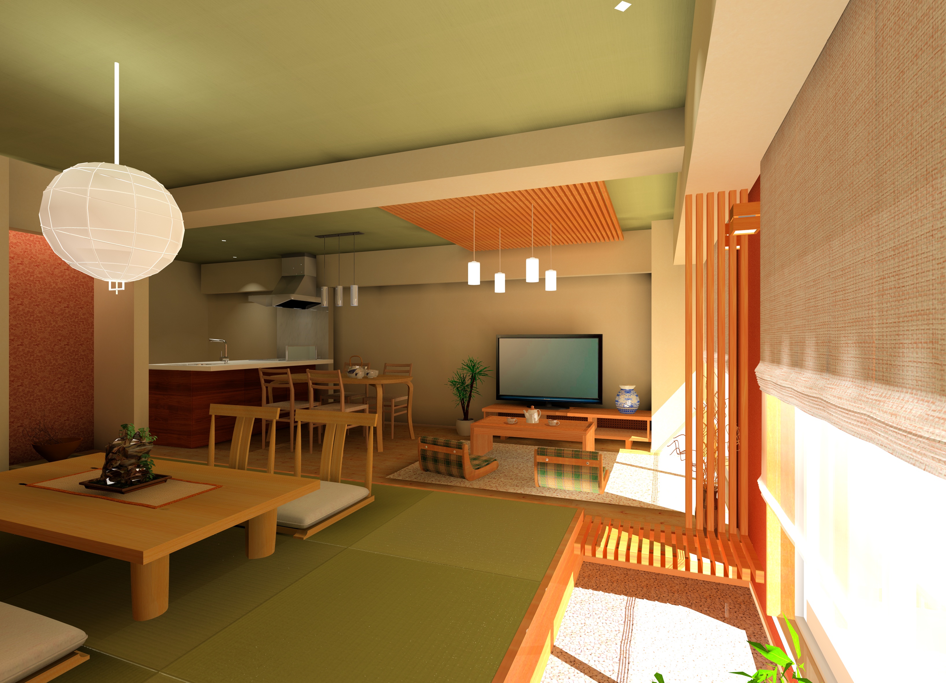 ポイントは「カラースキーム」「格子・障子の活用」「意匠をほどこした壁・天井」といい、床・建具には浮造り加工の無垢材を採用する。