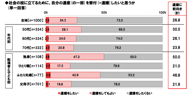 国境なき医師団日本(東京都新宿区)は6月24日~26日の3日間、50歳~79歳の男女を対象に「遺贈に関する意識調査2015」をインターネットリサーチし、このほど1000名の有効サンプルの集計結果を公開した。それによると「社会の役に立てるために、自分の遺産(の一部)を寄付(=遺贈)したいと思うか」との質問に対して、4人に1人が「前向きに検討」していることが分かった。
